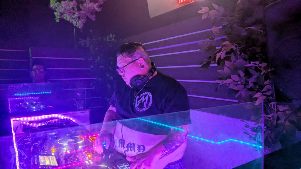 The evening’s opener, espurr, started the evening off strong with her set and really set the tone for the whole evening. We talked after her set about her music and style of DJ-ing, and she said that this particular evening gave her the opportunity to play something “a little chiller than usual” and she was “[inspired by] the space itself. I really love the lights…the sound system just gave me a lot of energy, so later into my set I kinda dip my toes into more clubbier songs”. Towards the end of her set, she included some Jersey Club and techno before passing the baton to the next DJ.