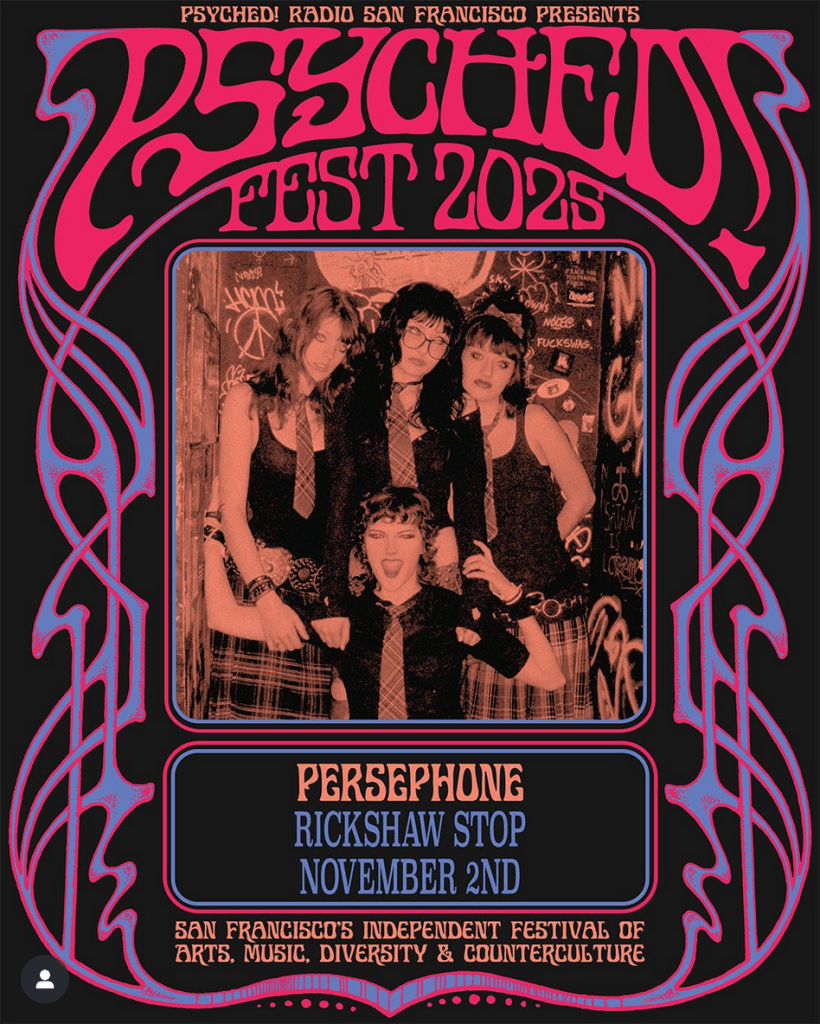 You can find Persephone on Instagram, YouTube, and Spotify, and you can definitely catch them performing live at various venues around the Bay Area, including November 2, 2025 at Psyched! Fest at Rickshaw Stop in San Francisco!